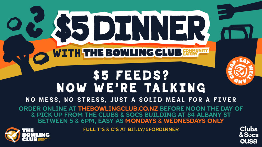 - OUSA Clubs and Socs offer $5 dinner in collaboration with The Bowling Club. Order your meal through The Bowling Club Website and pick up on Mondays and Wednesdays between 5 and 6pm at the OUSA Clubs and Socs building (84 Albany Street). Terms and Conditions can be found on the OUSA Clubs and Socs website.